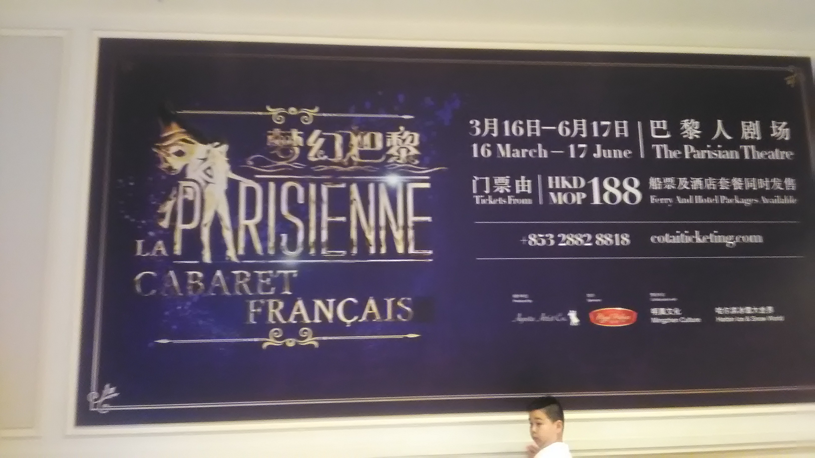 キャバレーフランセーズ?、ショーはもう最高!美男美女でまくりで、バックの映像と演者の動きがリンクして、奥行や躍動感が倍増し、目と耳を楽しませてくれる。途中中国語の歌を歌うシーンで私にマイクが来たときは冷や汗をかいたけど、両手でバツ印をつくるとすぐほかのお客さんのところへいってくれました。参加型のショーおそるべし。