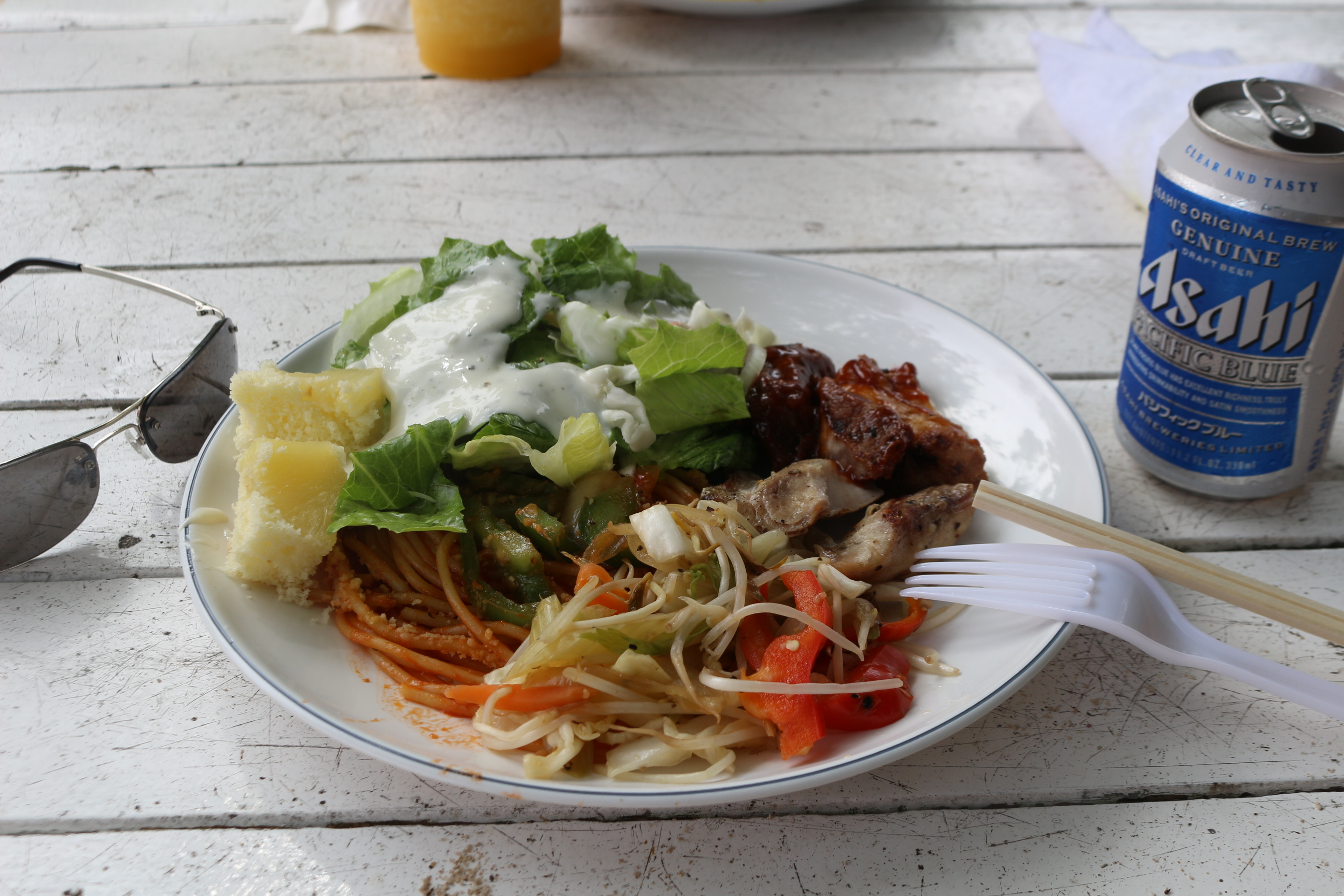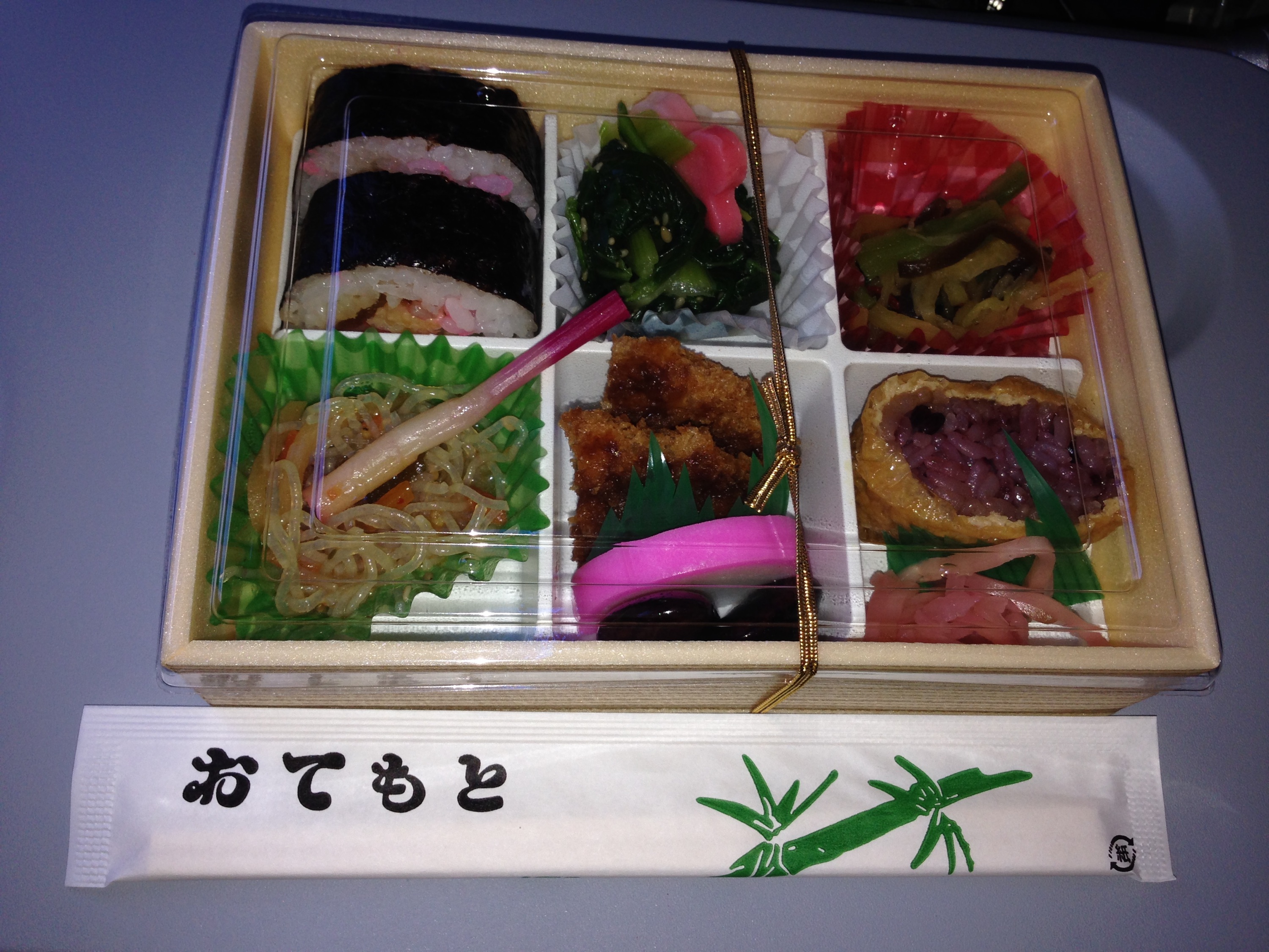 デルタ航空の機内食は簡単なハコ弁ですが、ビールのつまみと思えば満足でした。