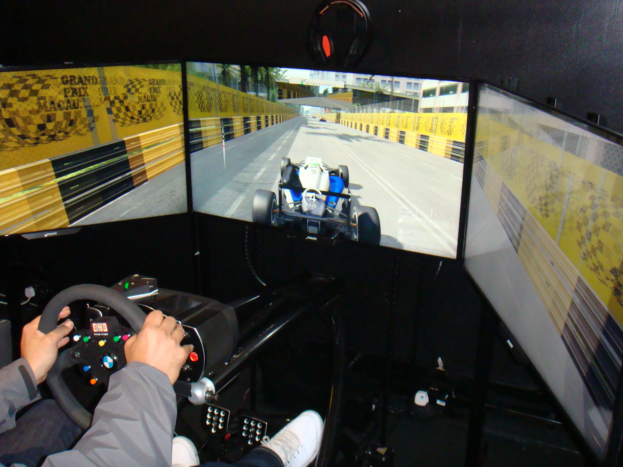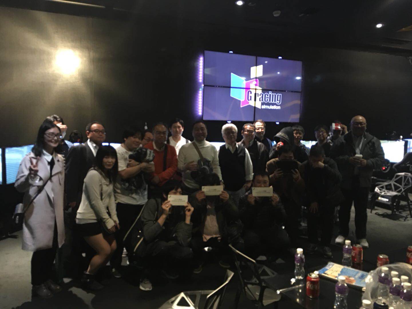 いよいよ、今オフ会の行事であるGレーシングシミュレーターを体験するため、11時に水晶宮に集合しました。マイクロバスでポンテ16へ移動し、シミュレーターの台数の関係で3組に分かれて、まずは練習体験です。前、右、左の三面のモニター映像はCGですが、本物のマカオグランブリのコースになっており、壁や車同士でぶつかると運転席に衝撃が走る仕様になっています。画面を見ながら、①アクセル、②ブレーキ、③ギアの切り替えを行うのですが、(1)見る、(2)判断する、(3)操作する、という作業をスムーズに継続するのはなかなか難しかったです。私は、「次は右~、しばらく直線でギアアップしてください」といった具合にkurutoさんに声でナビゲートしてもらいました。名前の公表は控えますが、「よしっ!大分、慣れてきた!」と期待させるようなことを言っておいて、本番ではスタートと同時に逆走し、うしろで観ていた人たちを爆笑の渦に陥れた方もいました(笑)。結果は、1位、りょうくんさん(唯一の5分台)、2位、はるっぴさん、3位、meiさん、となり、以上の方が商品獲得となりました。皆さん、おめでとうございます。
