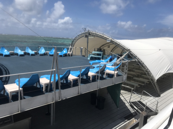 さて、私は念願のグレートバリアリーフでスキューバダイビングをするために、グリーン島到着から2時間後、さらに1時間ほど外洋に出たところにある巨大な2階建てのいかだみたいな「ポンツーン」に行ってきました。