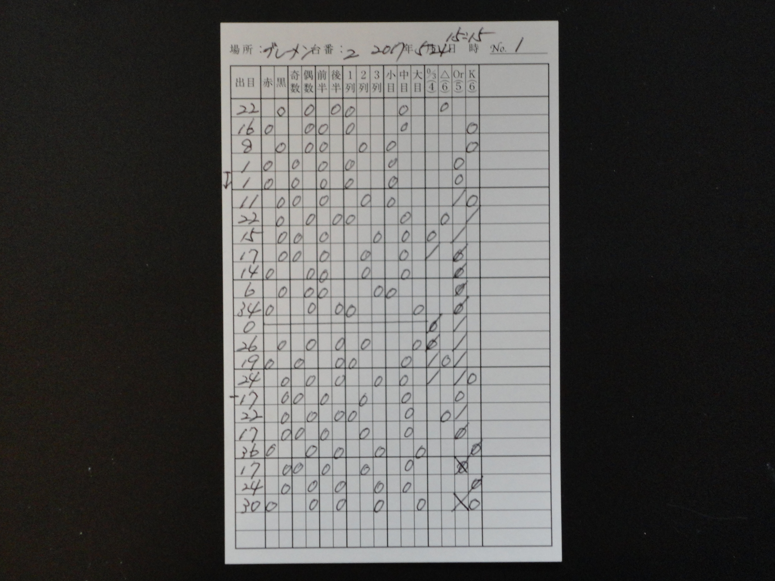 出目表には、ゾーンに賭ける時は当該のゾーンのスペースに斜線を引き(ダブルで賭ける時にはXの形)、実際に出た目の当該のゾーンに○印を記入する。