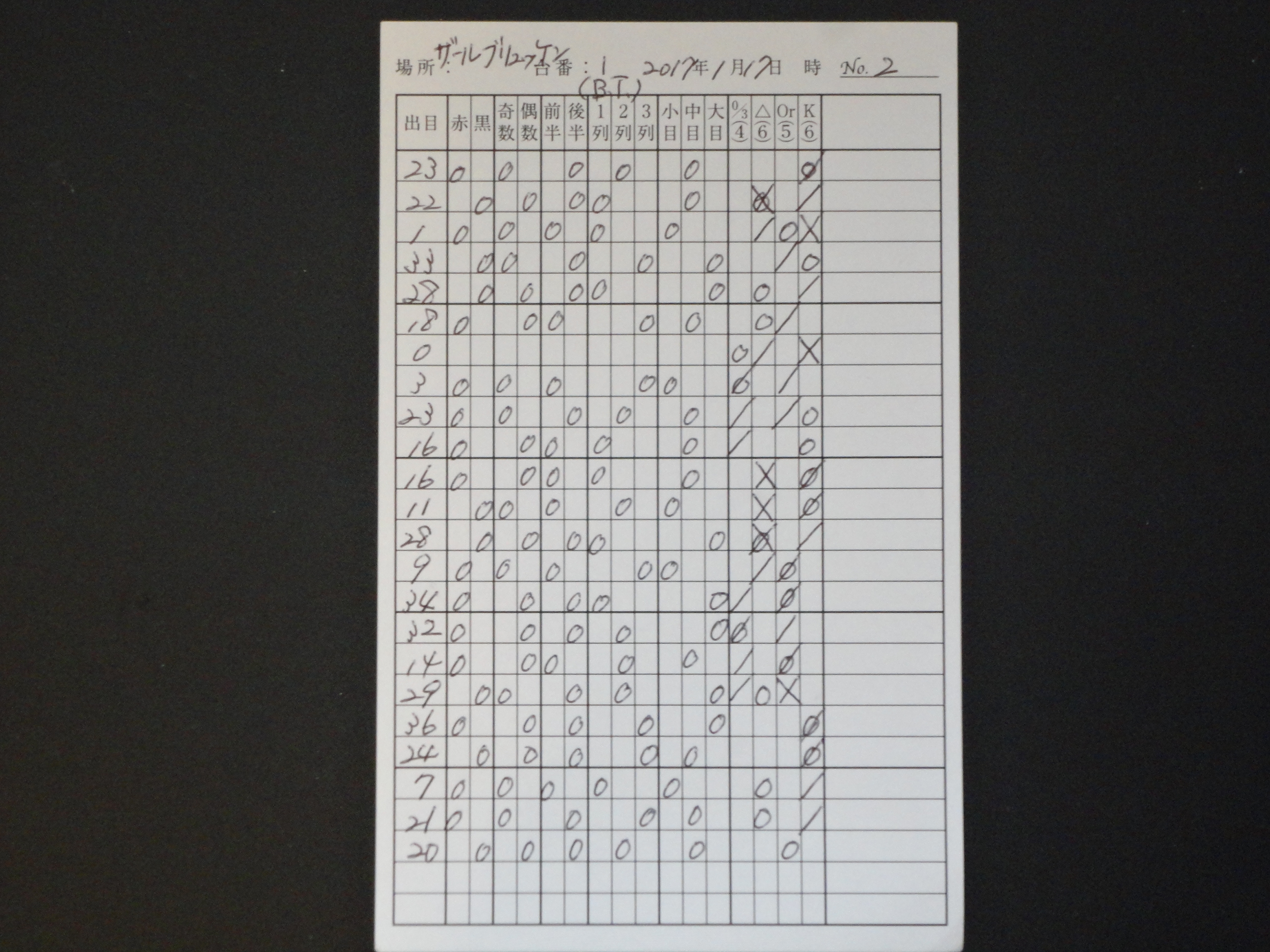 次は、Kに流れるだろうと、Kに6枚。大目の3列がアウトサイドから読めるので36ツボツボに5枚。