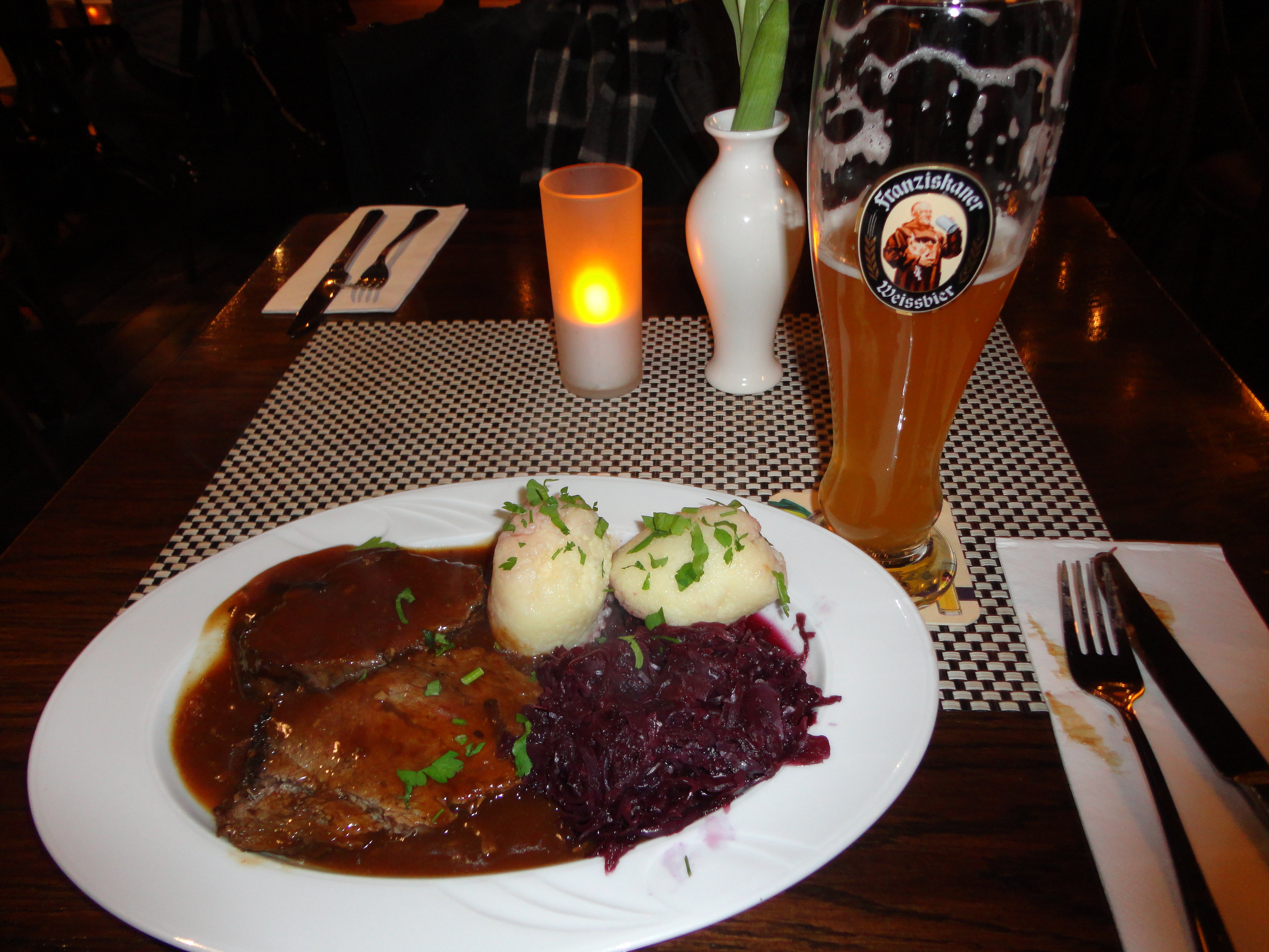 ビールはミュンヘンのフランシスカーナのヘフェ・バイツェンがあったので、これを頼む。料理はどんなものが出てくるか分からないので、一般的な豚肉の料理「ザワーブラーテン」を頼んだ。