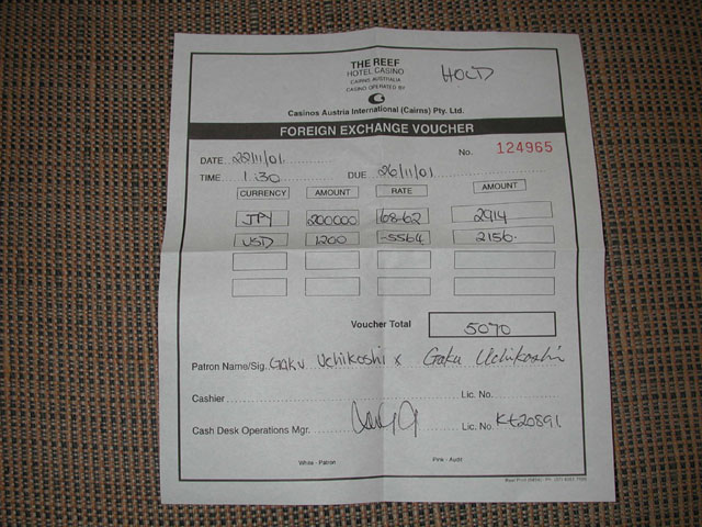 僕の他のオージーカジノレポートを参照していただければ詳しく記載してありますが、基本的にはオーストラリアのカジノはどこも同じようなシステムのようです。両替した日本円を後で同じレートで再両替してもらいたいときは、必ずホールドしてもらうように伝えましょう。チェックアウト日プラス1日の期限でホールドしてもらえます。