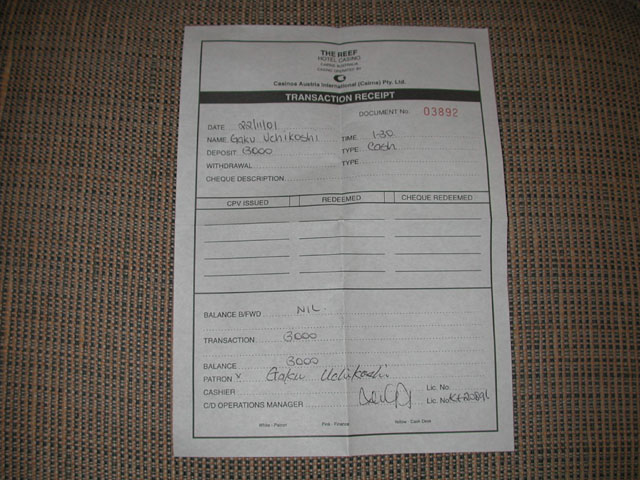 しかし、ケアンズのリーフでは、簡単ですが手続きが必要なようです。分りづらければ、日本人カジノホストに手続きを手伝ってもらうと良いでしょう。開設後は、プレイヤーズカードと前回のレシートにより、お金の出し入れができるようになります。大金を持ち歩かなくて安全かつ便利です。なお、ベガスのようにデポジットを担保にしてゲームテーブルでマーカーすることはできません。あくまでお金の出し入れはキャッシャーにて行います。