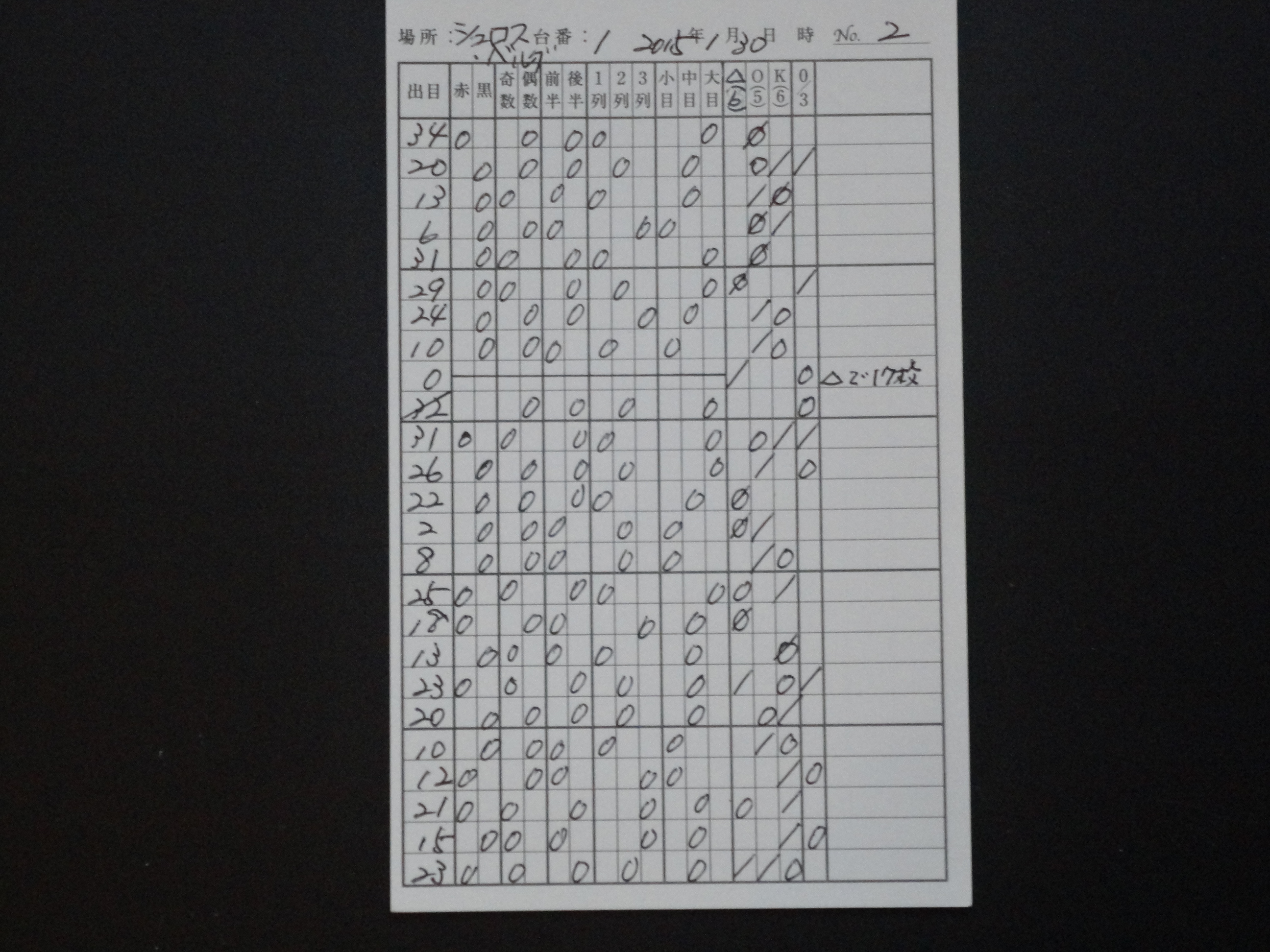 また、今回の旅打ちから出目表の書き方を変えた。原則、数字に賭けずゾーンだけなので、賭けたゾーンにあらかじめ斜線を引いておく。出た目は○で記入するので、当たれば斜線と○が重なることになる。「見」の場合、出目数字の欄にあらかじめ斜線を引いておくことにする。