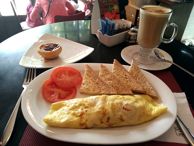 マカオ式エッグタルトの発祥の店として有名なベーカリーの、直営カフェで朝食です。