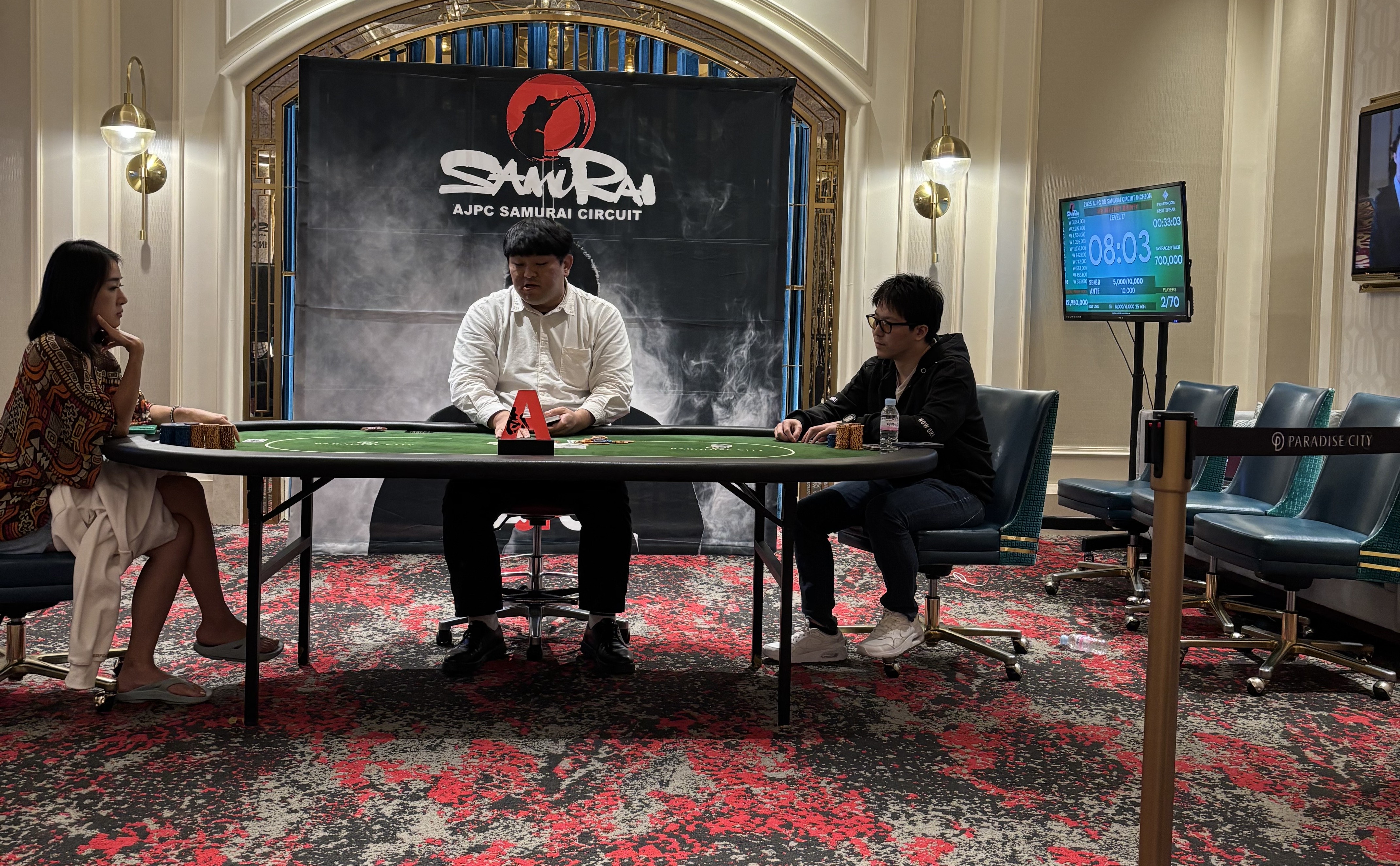 そのおかげで自分の順位は上がっていくのですが目的のクジの権利を得られないまま時間だけが過ぎていきます。 途中、激強オジ様が参加しない時に私が1人やっつけたのですが、その際に得たクジの結果は最低の30万ウォン。この時点での入賞金と合わせても参加費くらいにしかなりません。 でも残りのクジ10枚の状況で、1等の1000万ウォンの大当たりが残っているのでチャンスはあるね〜などと若い日本人プレイヤーと話をしていて、ぶっちゃけ半分の500万ウォンでも凄く嬉しいって話をしていたので、お互いに1枚づつクジの権利をゲットしたら折半しないかと提案してみました。もし500万ウォン貰えたら自分はこの遠征でほぼ勝ち確。仮に1人で1000万ウォン貰ったら税金とか申請とか面倒くさいので、提案を受け入れてくれる事を願っていたら、快く承諾してくれました。 私はブラフが得意なポーカープレイヤーではありますが、仏の様なピュアな面構えをしているので騙したりしないと信じて貰えてラッキーでした。でも先ずは他のプレイヤーを倒してクジの権利を得らなければ始まりません。しかし、なんとか私達は勝ち進み、お互い1枚づつ権利を獲得。私は残念ながらアンラッキーで5位敗退となりましたが、丁度休憩となり、お待ちかねのくじ引きタイムに突入です。残り10枚の内、当たりクジ1枚で私達は2枚引く事が出来るので20%で500万ウォンのBIGチャンス到来です。クジの方法は黒い封筒の中に当たりの金額が記入されている紙が入っているのですが、どの封筒が当たりだと思う?とパートナーと相談してお互い指差しをする事に。すると明らかに光輝く封筒が1つ紛れ込んでいるではありませんか(`・ω・´)