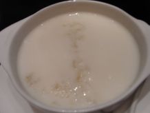 デザートになります。燕液蛋白杏仁茶。燕の巣のアーモンドスープです。燕の巣はウミツバメの巣で、崖に登って取ってこないといけません。ゼラチン質で体にとてもいいです。
